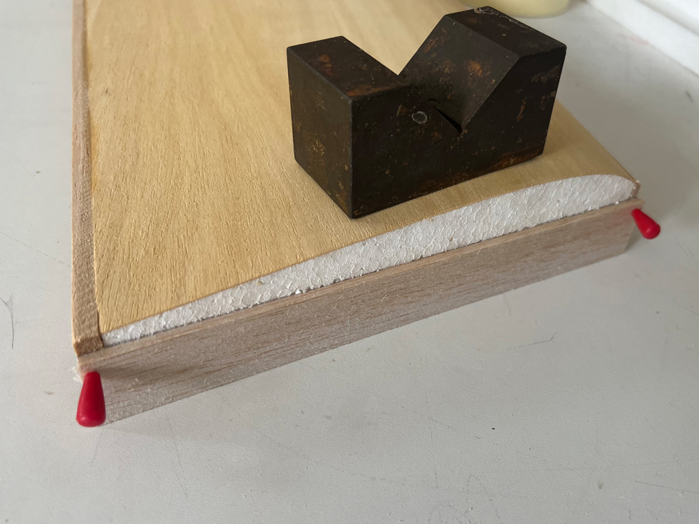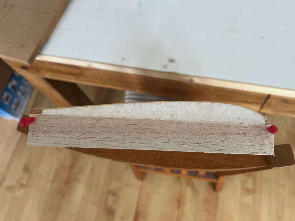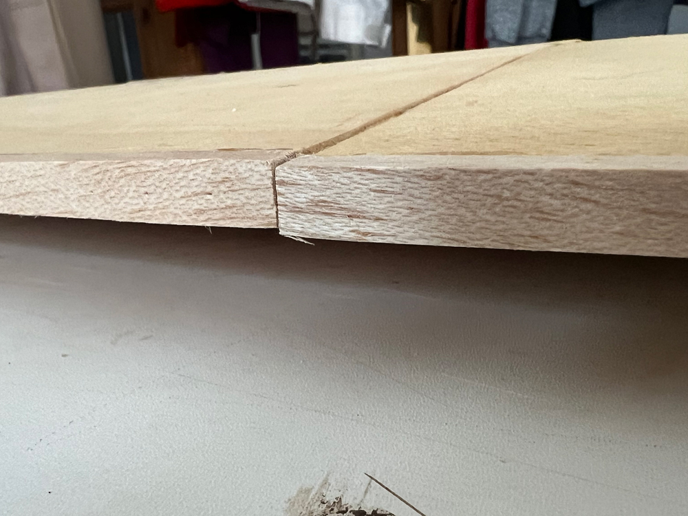 This is the fun bit, from this line and given the dihedral, you have to calculate the width of some 3mm balsa, such that when one edge is on the chord line the other edge protrudes to give the required dihdral measurment. This balsa has to be parallel